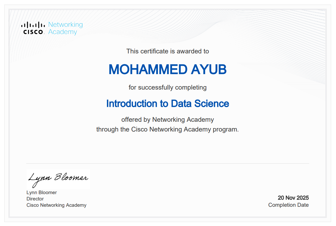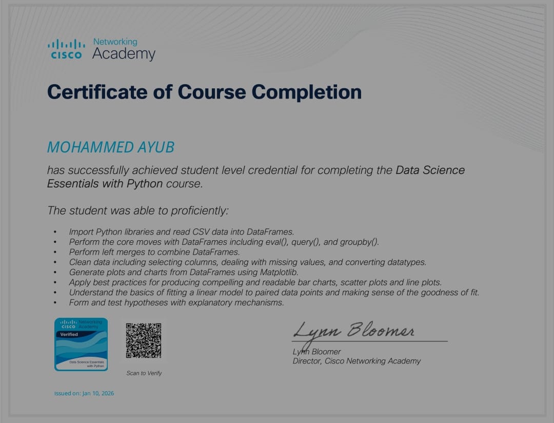 Completed a Cisco Networking Academy course covering core data science concepts, including data manipulation, exploratory analysis, and visualization using Python, with hands-on practice on structured datasets.