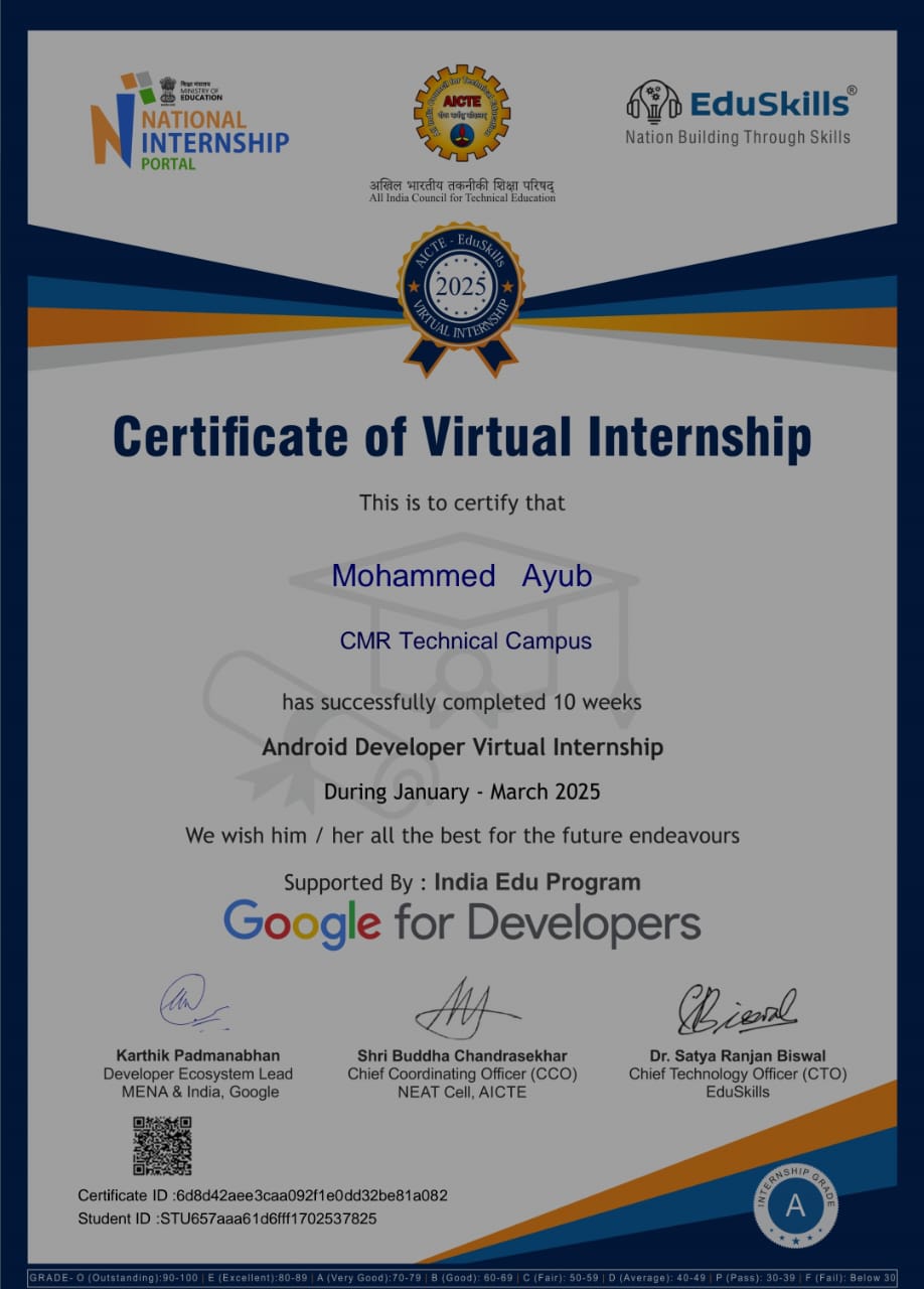 Completed the Android Developer Virtual Internship by AICTE-Eduskills, gaining hands-on experience in building Android applications using modern development tools and frameworks. Learned essential concepts of app development, UI/UX design, and debugging to create functional and user-friendly mobile applications.