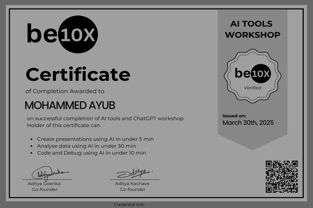 Attended an online workshop that introduced various AI tools and their practical applications. Learned how to use AI to improve productivity, creativity, and efficiency in both personal and professional tasks.