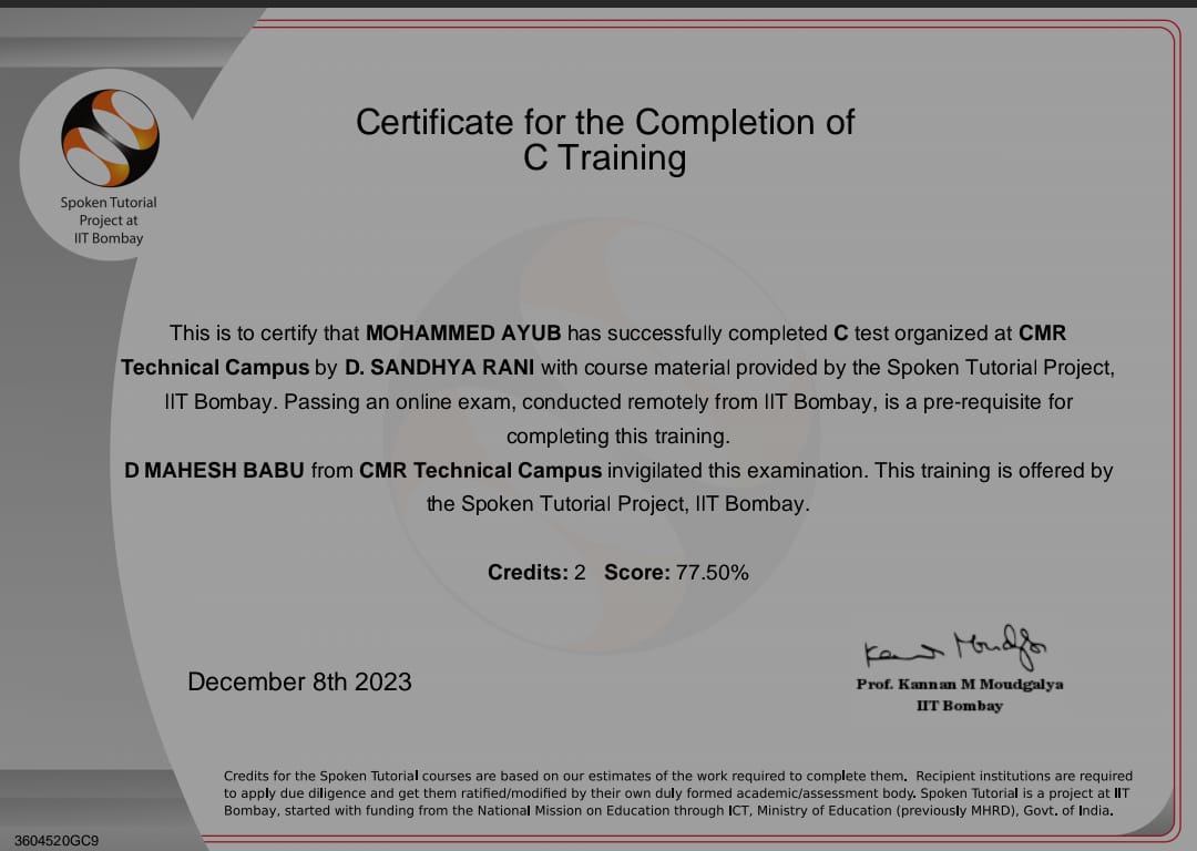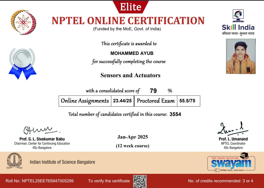 Successfully completed an 8-week NPTEL course on Sensors and Actuators with a score of 79%, earning an Elite + Silver certificate. The course covered working principles, types, and applications of various sensors and actuators used in embedded systems and IoT.