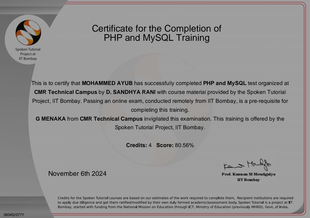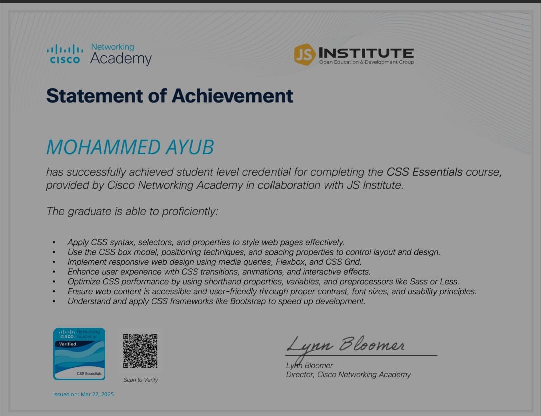 Completed a foundational course on Cascading Style Sheets (CSS), covering core concepts like selectors, layout techniques, colors, typography, and responsive design. Gained practical experience in styling modern, visually appealing web pages.