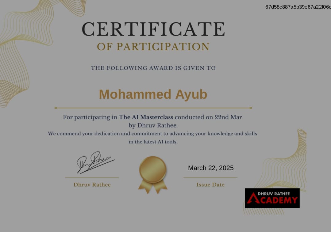 Attended an online masterclass by Dhruv Rathee focused on practical AI tools for image generation, video creation, code assistance, and data visualization. Gained insights into how these tools are revolutionizing creativity, productivity, and tech workflows.