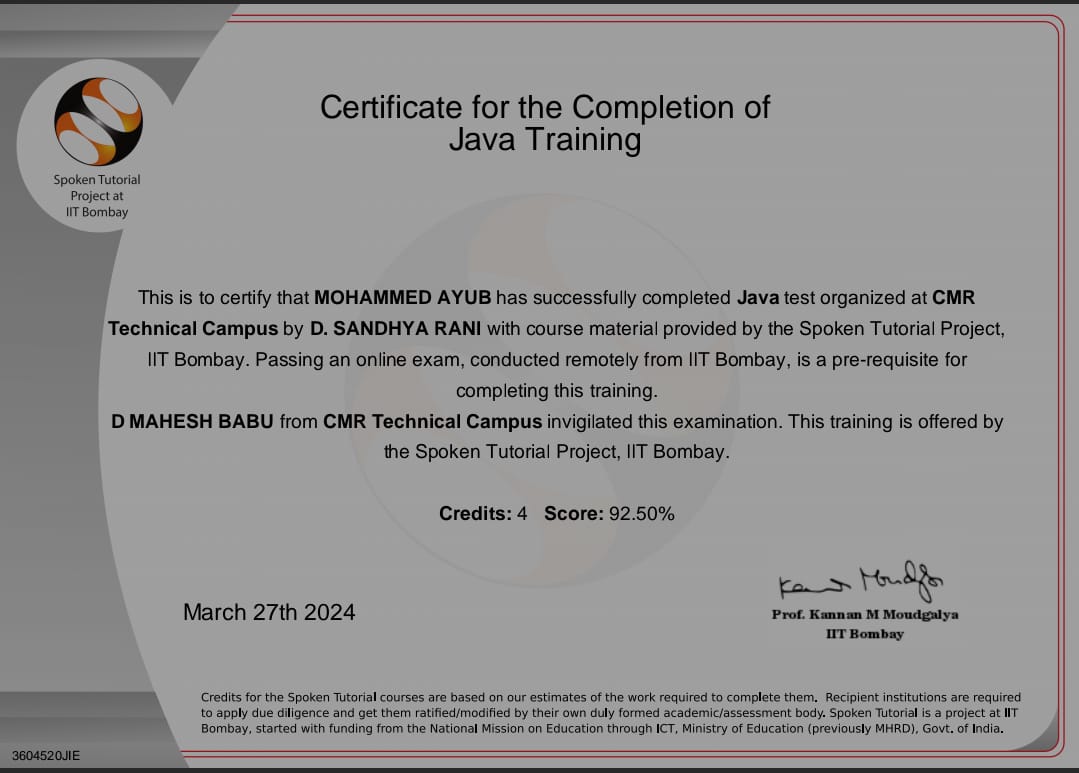 Completed Java training, gaining a strong foundation in object-oriented programming (OOP), exception handling, multithreading, and data structures. Developed hands-on experience in writing efficient Java programs and understanding core concepts.